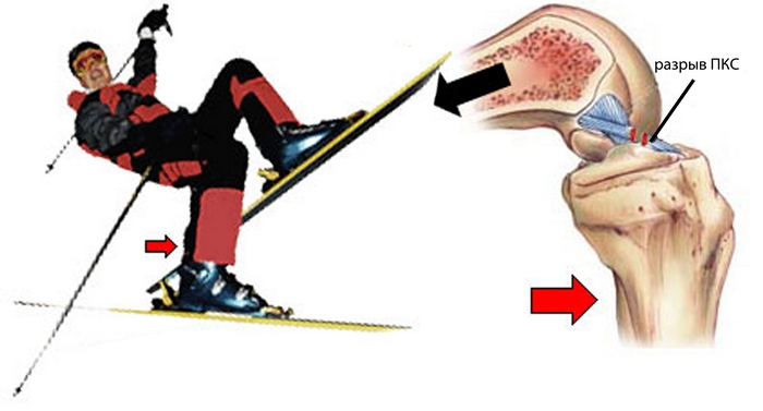 Механизм, обусловленный лыжным ботинком. Чаще всего разрывы передней крестообразной связки по этому механизму происходят у горнолыжников, которые носят более высокие и жесткие ботинки. Например, при падении назад верхняя часть ботинка передает нагрузку на верхнюю часть голени большеберцовой кости по типу «выдвижного ящика». Бедро кость смещается назад, а голень удерживается задним краем высокого ботинка. Передняя крестообразная связка натягивается и рвется. Фиксированный наклон вперед во всех современных лыжных ботинках способствует такому типу разрыва. |